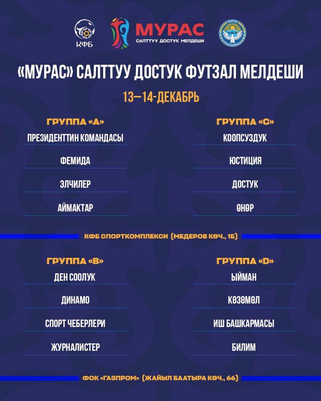 Завтра, 13 декабря, стартует традиционный дружеский турнир «Мурас». Отметим, что турнир был инициирован Кыргызским футбольным союзом в 2022 году и поддержан Президентом Кыргызской Республики Садыром Нургожоевичем Жапаровым. Этот дружеский турнир, ставший доброй традицией, в текущем году проводится уже в девятый раз.