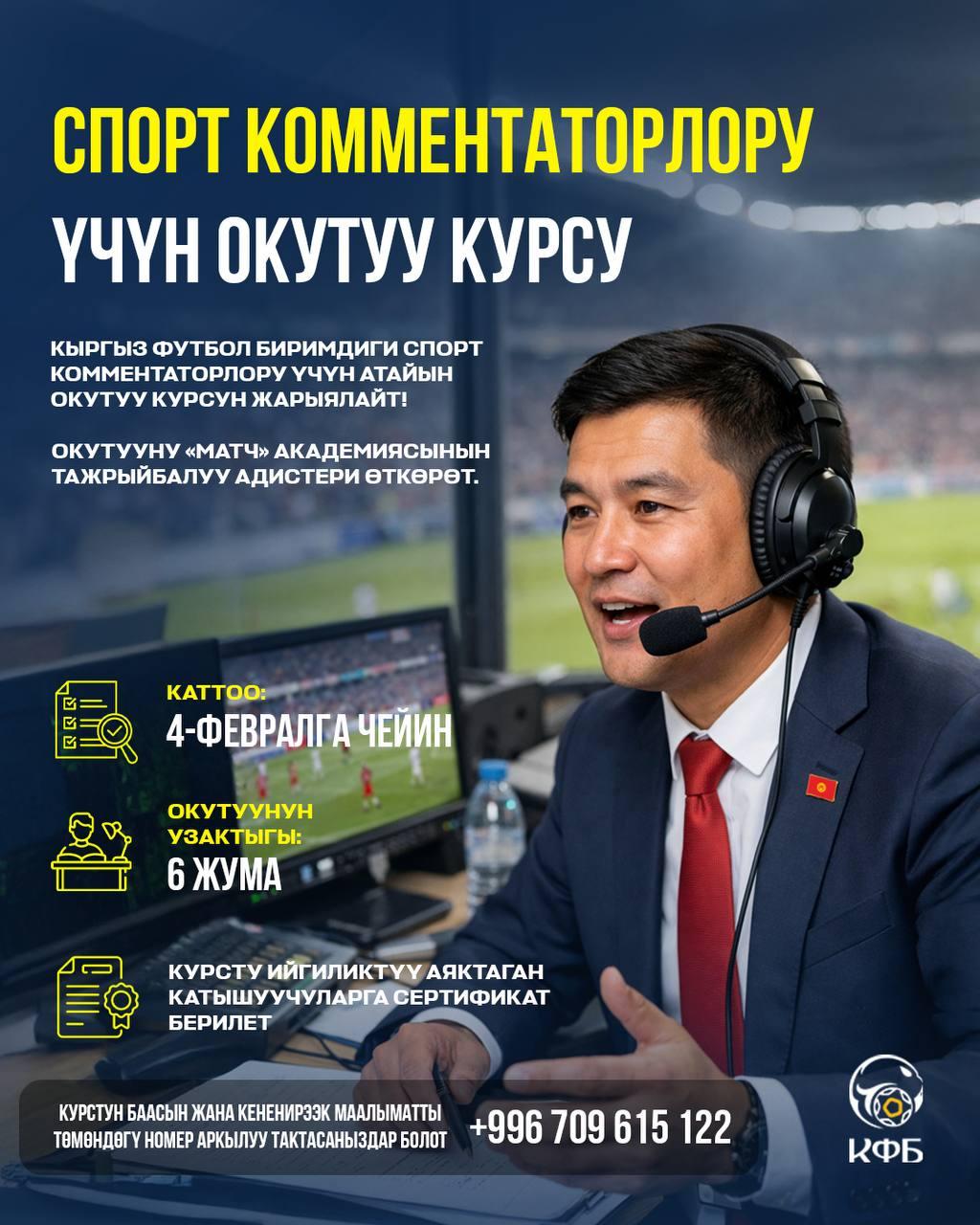 Кыргызский футбольный союз объявляет набор на специализированный обучающий курс для спортивных комментаторов — всех, кто хочет профессионально работать в сфере спортивных трансляций и развивать навыки качественного футбольного комментария.