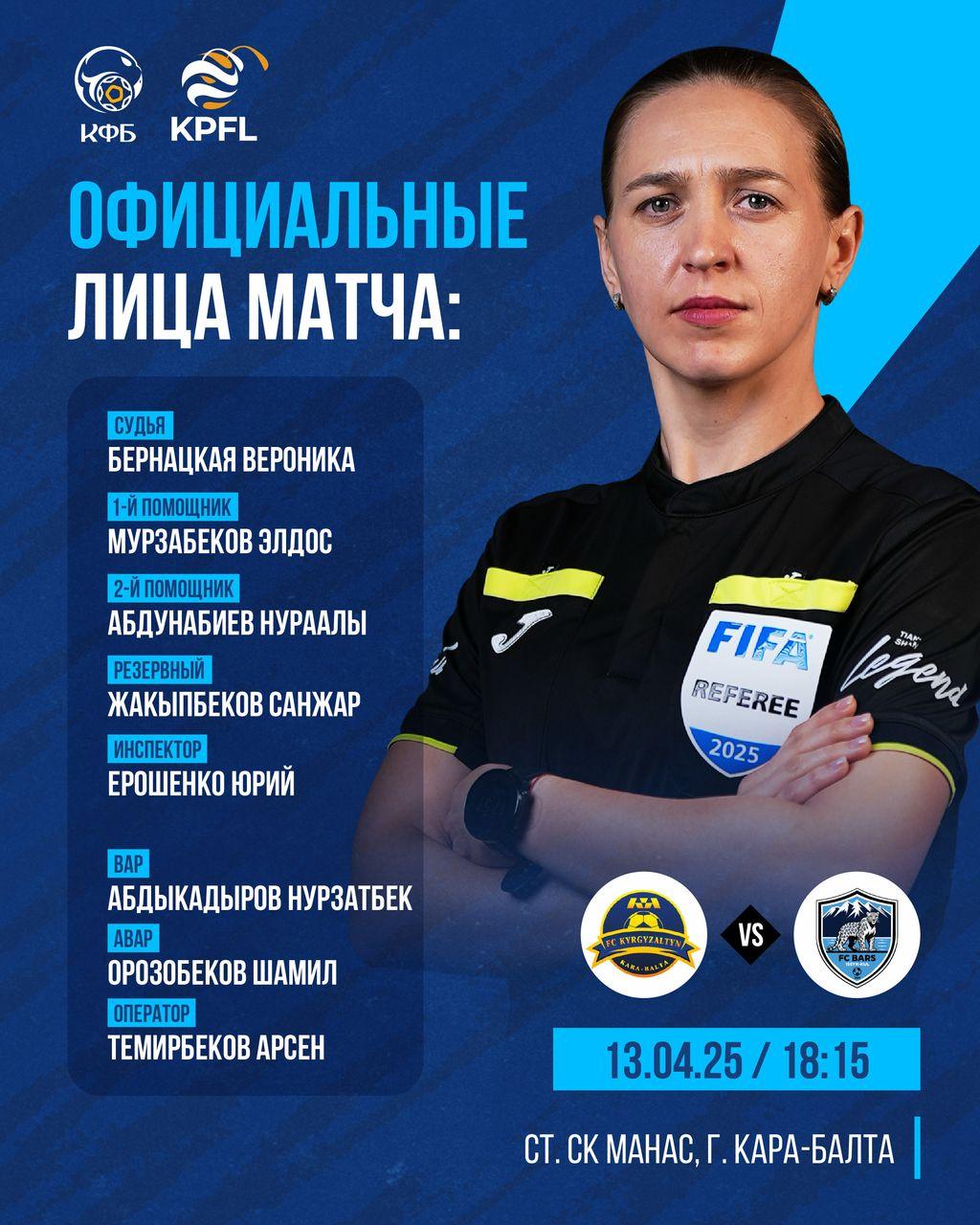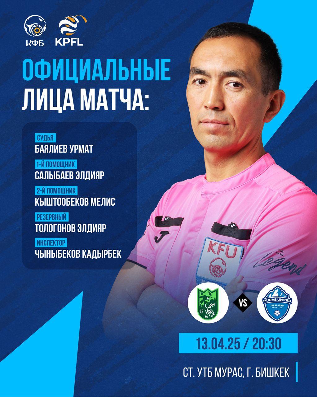 Кыргызский футбольный союз представляет список официальных лиц матчей пятого тура Премьер-Лиги Кыргызской Республики 2025 года: