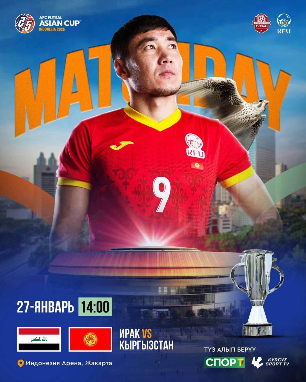 Сегодня, 27 января, в столице Индонезии — Джакарте — стартует Кубок Азии по футзалу 2026 года. В рамках стартового тура сборная Кыргызстана встретится с командой Ирака. Матч пройдёт на площадке «Indonesia Arena».